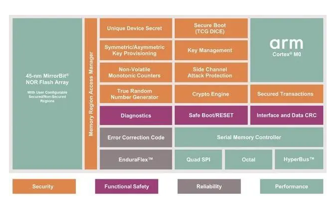 Semper Secure NOR闪存提供四路串行外设接口(SPI)、八路SPI以及HyperBus接口,其中八路和HyperBus接口的设备符合针对高速x8串行NOR闪存的JEDEC eXpanded SPI(xSPI)标准,并支持高达400MBps的读取带宽。